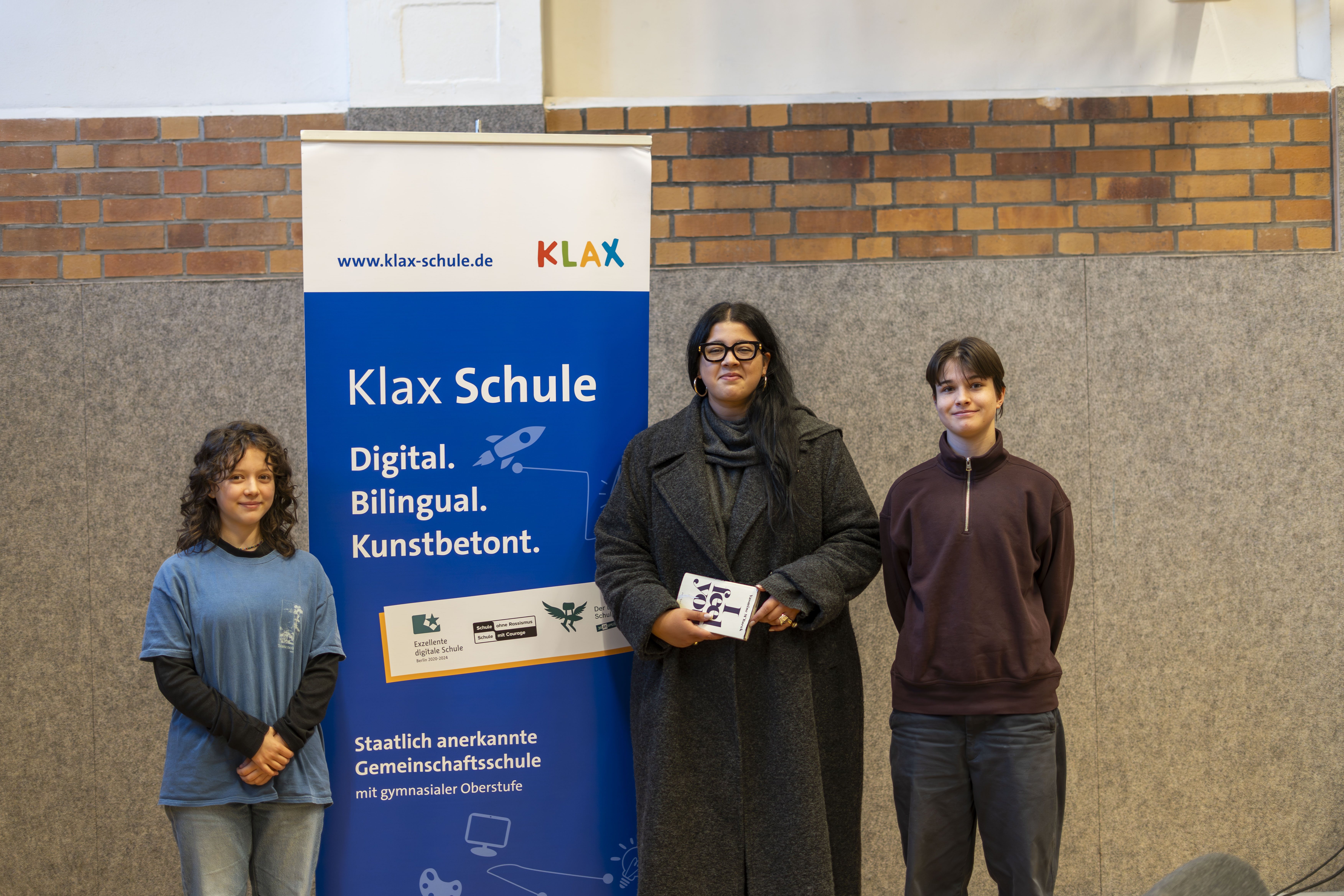 Im Rahmen des bundesweiten Vorlesetages gab Yasmine M’Barek am 21.11.2025 in der Turnhalle der Klax Schule einen lebhaften Einblick in ihr Buch. Zwei Schüler*innen aus der Oberstufe moderierten die Veranstaltung und führten nach der Lesung durch eine Fragerunde mit ihren Mitschüler*innen. Es entwickelte sich eine spannende Diskussion mit vielen persönlichen Beiträgen aus der Schulgemeinschaft. Yasmine M’Barek machte dabei deutlich: Empathie ist nicht nur Mitgefühl, sondern bedeutet auch, die Beweggründe anderer Menschen zu verstehen – ein Grundsatz, der auch im Journalismus eine zentrale Rolle spielt.