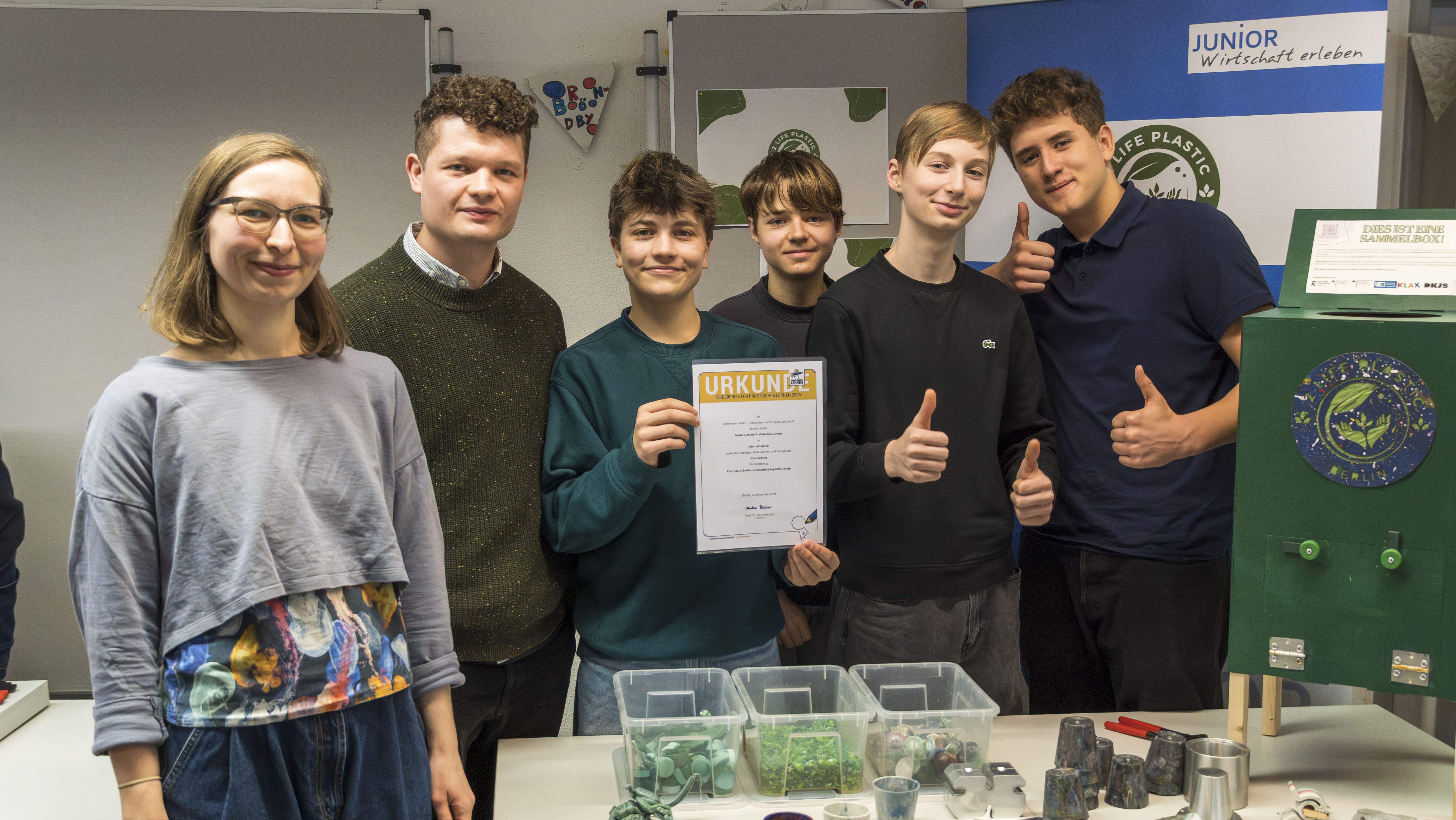 Ein zentrales Ergebnis ihrer Arbeit sind die neu entwickelten Sammelboxen, die gemeinsam mit Kooperationspartnern an mehreren Berliner Standorten aufgestellt wurden. Die gesammelten Plastikabfälle werden im Makerspace der Klax Schule weiterverarbeitet und zu Gebrauchsgegenständen wie Kreiseln oder Kämmen recycelt – ein sichtbarer Beitrag zu aktivem Umweltschutz und ein beeindruckendes Beispiel dafür, wie Schüler*innen nachhaltige Prozesse selbst gestalten können.