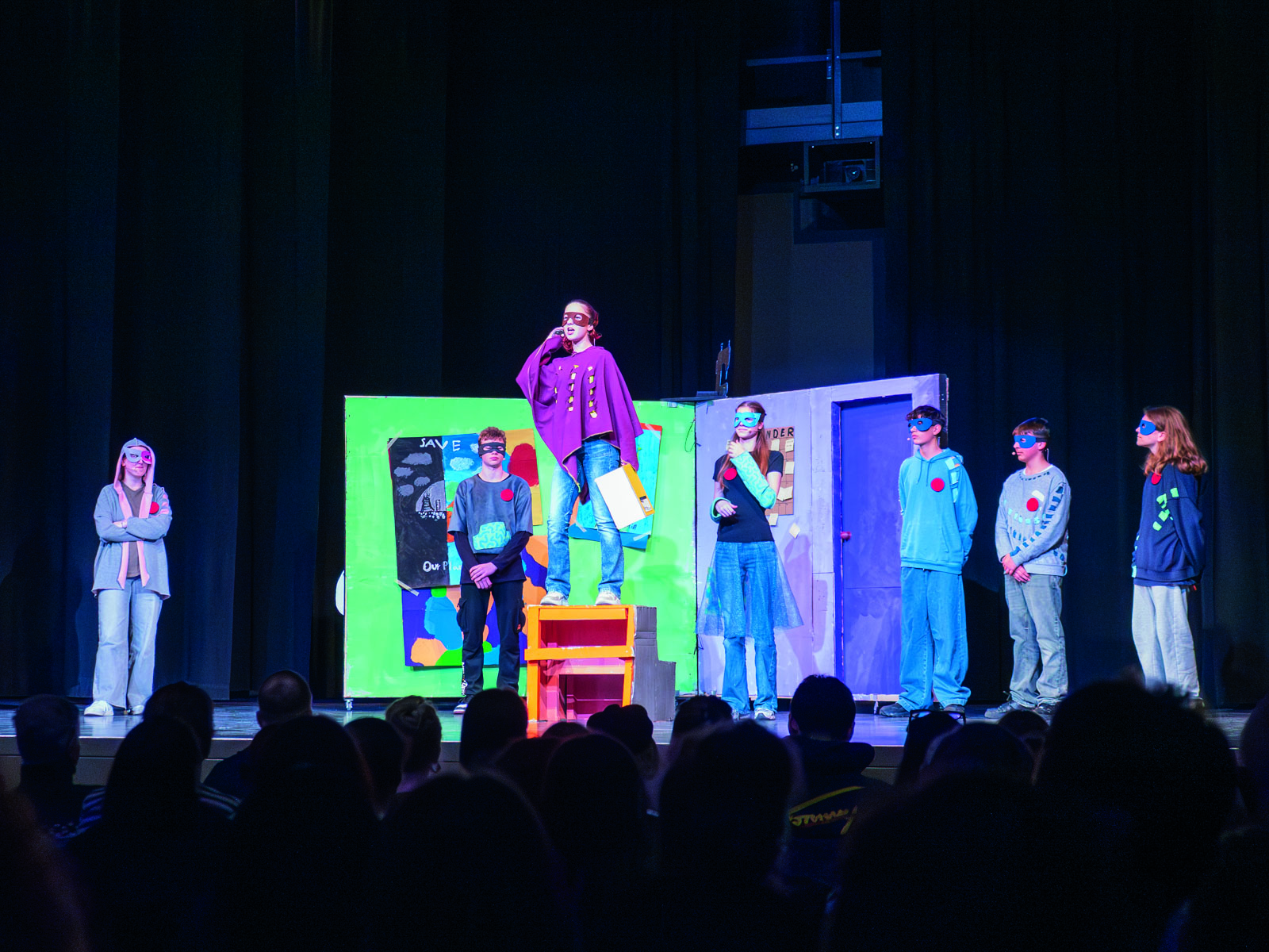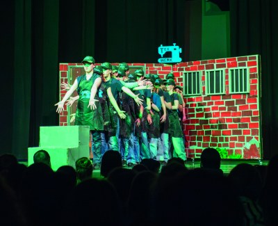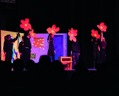 70 young people performed on stage, while another 65 worked in workshops such as set design, costume, props, and video design to bring the production to life. The concept and artistic direction were in the hands of the students themselves, supported by their learning guides. One particular highlight was a revolving stage made of cardboard, designed, built, and operated by the students during the performance.